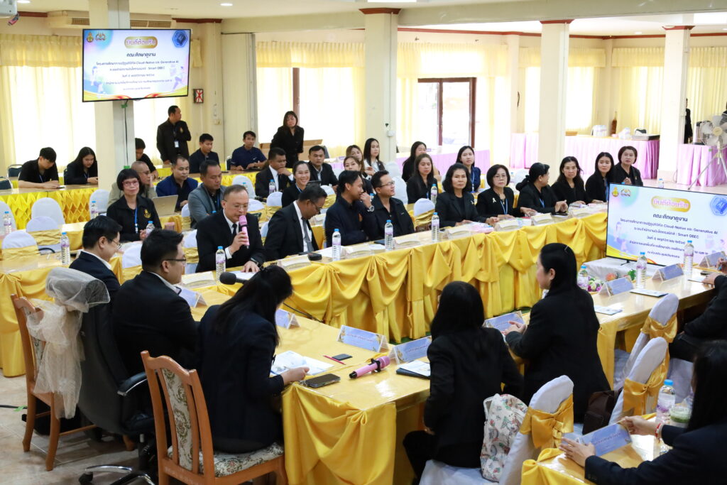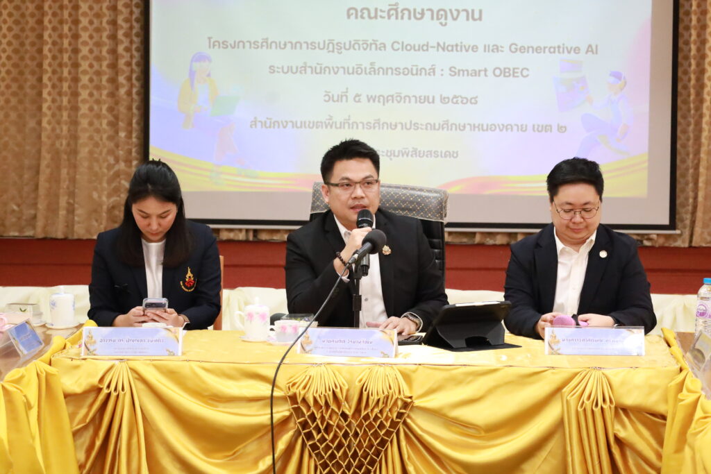 วันที่ 5 พฤศจิกายน พ.ศ. 2568 นางสนม เสริฐผล ผอ.สพป.หนองคาย เขต 2 ประธานในการประชุมฯ พร้อมด้วยนายพัชระ งามชัด รอง ผอ.สพป.หนองคาย เขต 2 นายบัณฑิต เดชขันธ์ รอง ผอ.สพป.หนองคาย เขต 2 นายสัมพันธ์ พันธ์พิมพ์ ผอ.กลุ่มนโยบายและแผน ปฏิบัติหน้าที่ ผอ.กลุ่มส่งเสริมการศึกษาทางไกล (ICT) นำคณะผอ.กลุ่ม/หน่วย คณะศึกษานิเทศก์ และบุคลากรในสังกัด ร่วมต้อนรับคณะศึกษาดูงานระบบบริหารจัดการสำนักงานอิเล็กทรอนิกส์ จากสำนักงานคณะกรรมการการศึกษาขั้นพื้นฐาน และมหาวิทยาลัยราชภัฏสวนสุนันทา เพื่อศึกษาการปฏิรูปดิจิทัลฯ กรณีศึกษาระบบ SMART OBEC เพื่อพัฒนาและสร้างต้นแบบระบบสำนักงานอิเล็กทรอนิกส์ของ สพฐ. โดยใช้เทคโนโลยีคลาวด์และปัญญาประดิษฐ์เชิงสร้างสรรค์ (Generative AI) ณ หอประชุมพิสัยสรเดช สพป.หนองคาย เขต 2